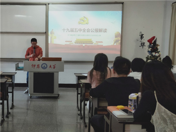11月16日下午,hth华体育官网学生党支部于hth华体育官网第三校区普照楼302开展《中国共产党第十九届中央委员会第五次全体会议公报》专题学习会,会议由支部书记陈国伟主持,支部全体学生党员参加本次活动。