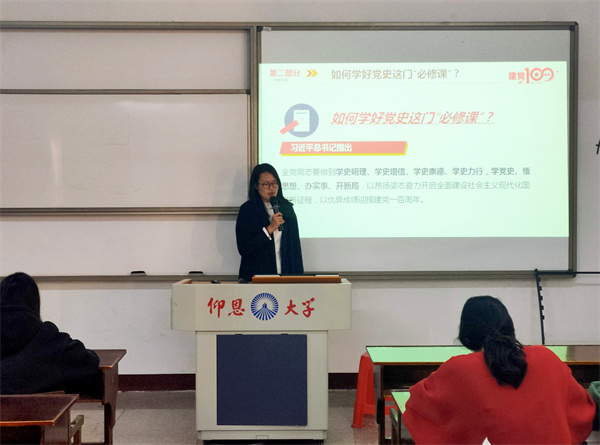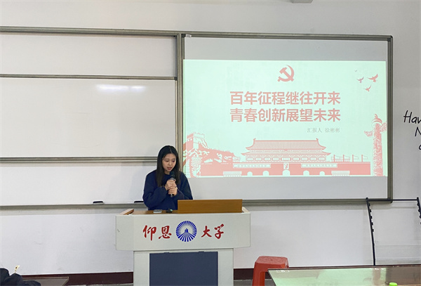 会议伊始,林婉倩同志结合自身学习、工作和生活,以“如何学好党史”为切入点,指出全体党员要肩负起新时代中国共产党人的初心和使命、坚持和拥护党的领导,勿忘昨天的苦难辉煌,无愧今天的使命担当,为实现中华民族伟大复兴的中国梦添砖加瓦。徐彬彬同志以党的百年光辉历程为线索,带领党员同志们深刻地感受中国共产党百年峥嵘岁月中流传的革命精神,并结合当今时代背景,指出当代青年应尽其所学为国效力,为国家抗疫事业做出贡献,为传承革命精神做出实际行动,让红色基因、革命薪火代代传承!