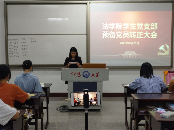 6月21日,hth华体育官网学生党支部于普照楼303教室召开预备党员转正会议,大会的主要议题是讨论关于周日萍等21名同志转为正式党员的问题。会议由hth华体育官网学生党支部书记吴姗姗主持,支部全体党员参加。  (会议现场图) 会议开始,吴姗姗同志通报了到会党员人数,到会人数符合党章和基层党组织换届选举的相应规定,预备党员转正会议正式开始。随后21位预备党员依次发言,由入党介绍人以及与会党员分别对转正同志一年预备期的表现进行总结评价,并就是否同意转正表明了自己的意见。之后由到场的正式党员进行无记名投票表决,通过预备党员转为正式党员的申请。会议最后一项,在郑薇同志的带领下,21名同志面对党旗郑重宣誓。 会议尾声,支部书记吴姗姗对转正大会进行了简要总结和点评。向21名同志表示祝贺,同时,希望转正的同志们能够践行他们的展望与初心,将初心落到实处,也希望他们能够履行党员的义务,认真学习党章,认真完成支部的任务,为群众树立榜样,学好理论知识,将理论与实际结合,永不懈怠,向着一名合格的共产党员前进,坚持吃苦在前,享受在后的精神,积极回馈社会,服从组织安排,真正做到在思想上入党。(hth华体育官网学生党支部/图文)