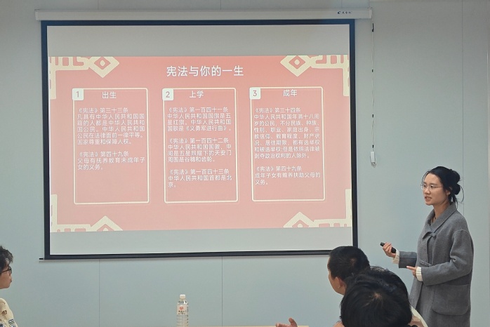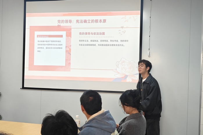 活动伊始,主持人林为臻老师从宪法的定义、地位、宪法日设立初衷及发展历程切入,阐释了宪法作为根本大法的核心内涵,让大家深刻体会到宪法的生命力在于日常生活。而后,三位hth华体育官网学生接续分享,围绕“坚定宪法自信”“普法护航”“青春与法”等主题,结合电信诈骗治理数据、校园欺凌案例、劳动者休息权保障等热点,介绍了宪法、民法典、劳动法等常用法律知识,呼吁青年学生争做法治的忠实崇尚者、自觉遵守者和坚定捍卫者。同时,在致远、宏船书院门口设立宣传点,邀请hth华体育官网教师为过往的学生讲解宪法知识,解读宪法中关于公民权利保障的核心条款,并组织志愿者向校内师生分发宪法宣传册,共同推动本校学生在实践生活中增强对宪法的认同感和践行意识。